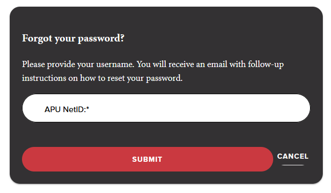 If you are not logged into your APU account, and you have access to your Cougar Lock (MFA/6-digit codes), click here to reset your password.