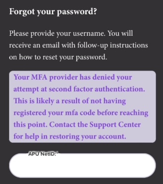 When you click on the link, it should ask for your APU NetID. Enter your NetID, and hit Submit. Your NetID is the first part of your APU email WITHOUT the @apu.edu. You should receive a password reset link to your personal, Non-APU email address on file. After you click on the link in the email, you will be asked to enter your 6-digit code from the authenticator app to reset your password. If you DO NOT have access to your codes, please reach out to [email protected].